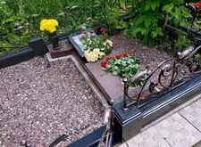Так выглядит окончательный вариант места захоронения. В правую верхнюю часть надгробья мы установили заранее изготовленный элемент, на территорию участка досыпали каменную крошку, цветник наполнили мульчей.